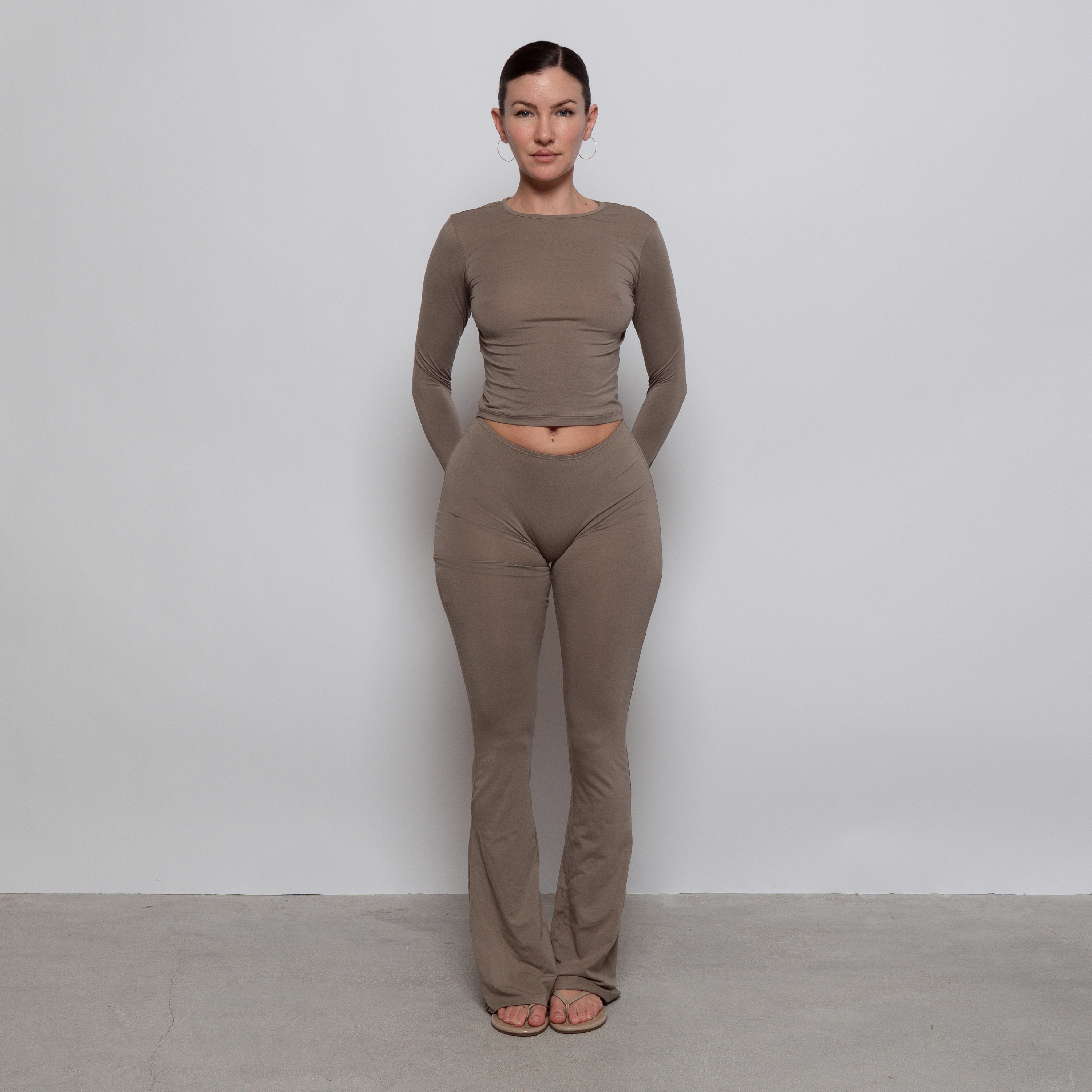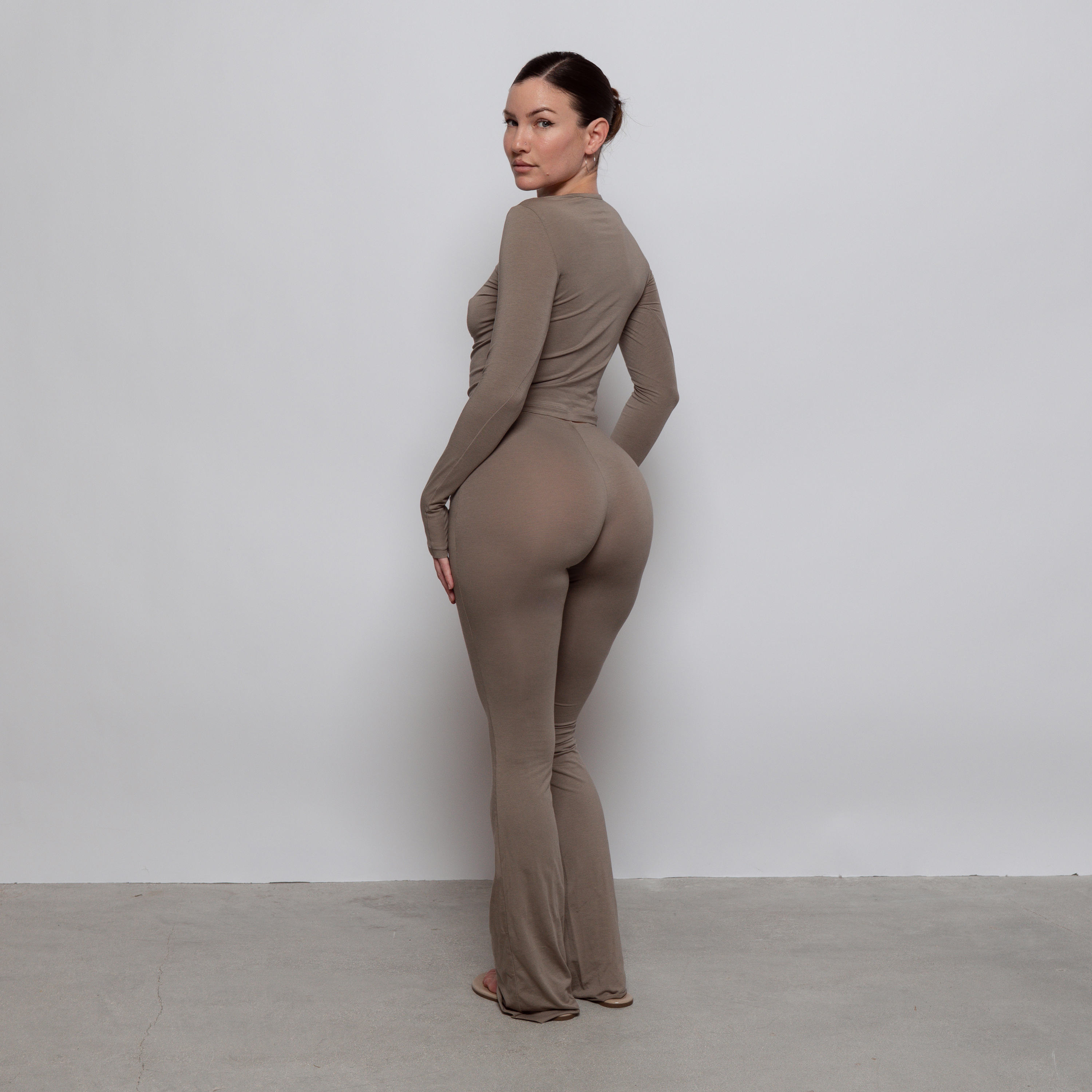 High-waisted flare lounge pants with a thin elastic waistband to hug your curves and snatch your waist. Single-lined, micro-modal cotton fabric that hugs every curve. Seamless on the front, but seam on the back rise to accentuate the booty. More sheer in lighter colors. Can be worn out and about or lounging around. Pairs perfectly with our other lounge styles but also our originals collection as well.