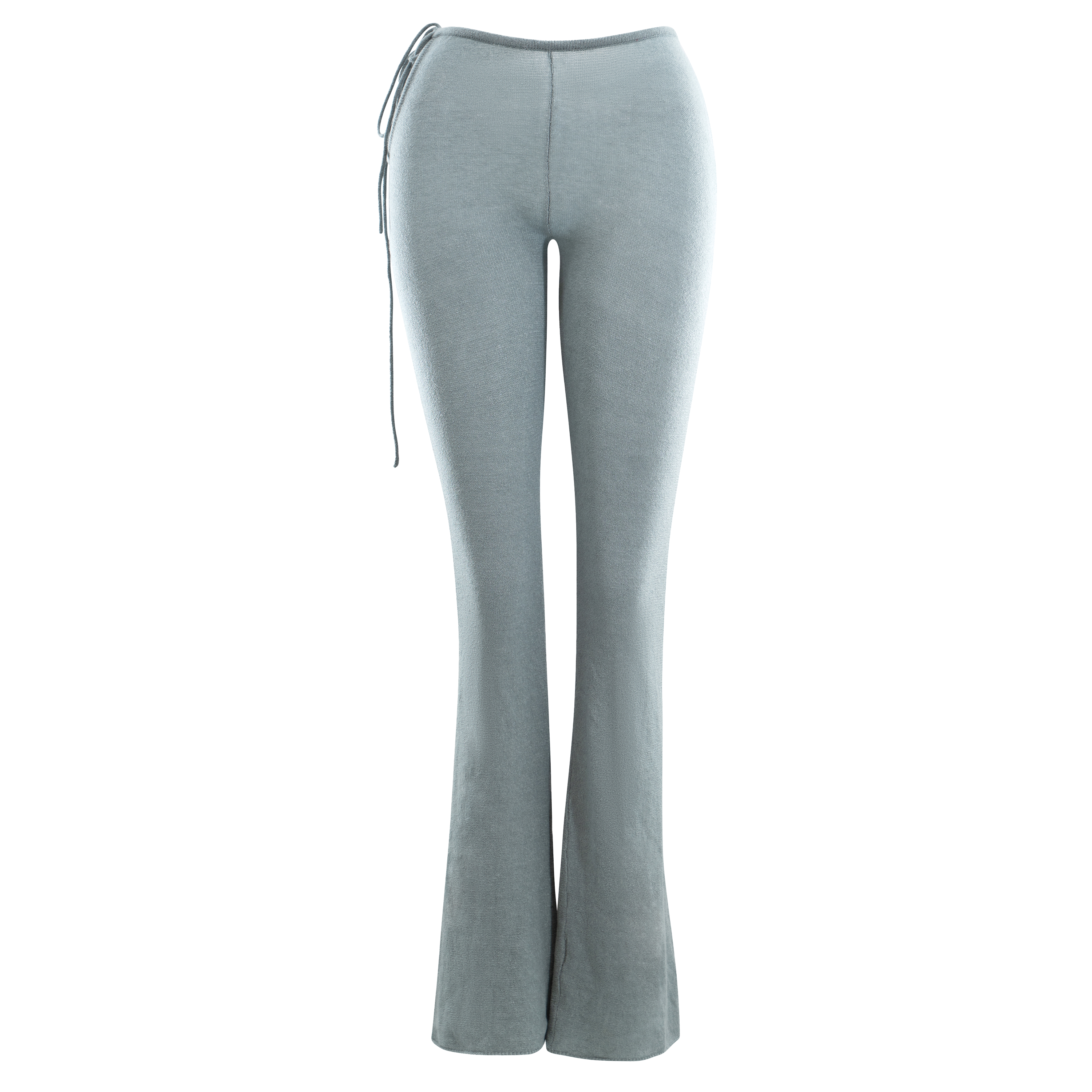 Our Knit Tie Side Flares are a mid rise flare with an open cut out on one side and a draw string at the waist. Single lined with our newest woven knit.