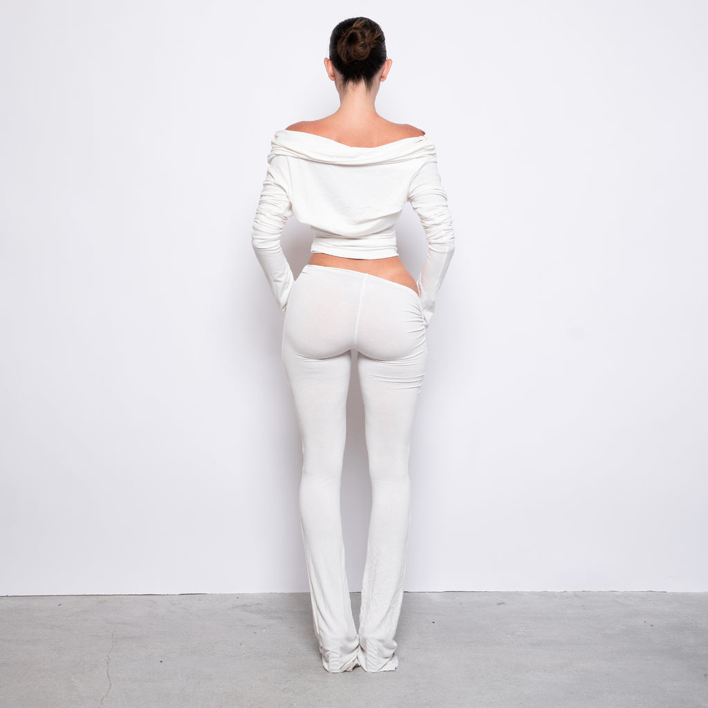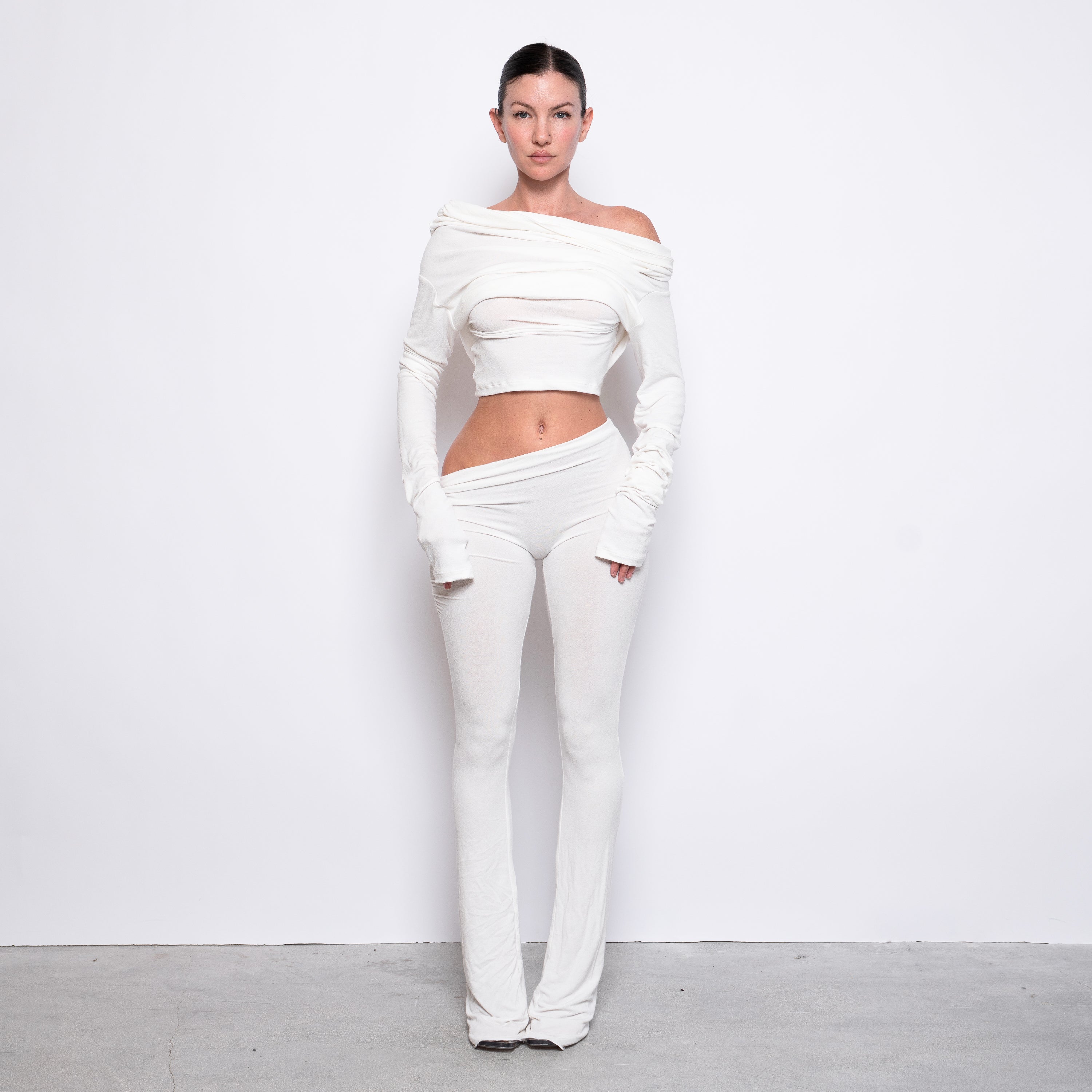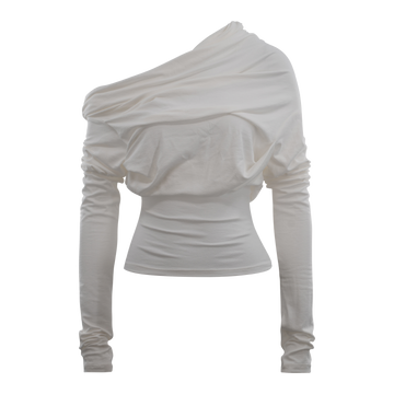 Our newest long sleeve drape top is the perfect draped off the shoulder long sleeve. Made to order in Miami of our drape material. Can be worn off the shoulders or draped over the shoulders. Mix and match with our other drape styles.