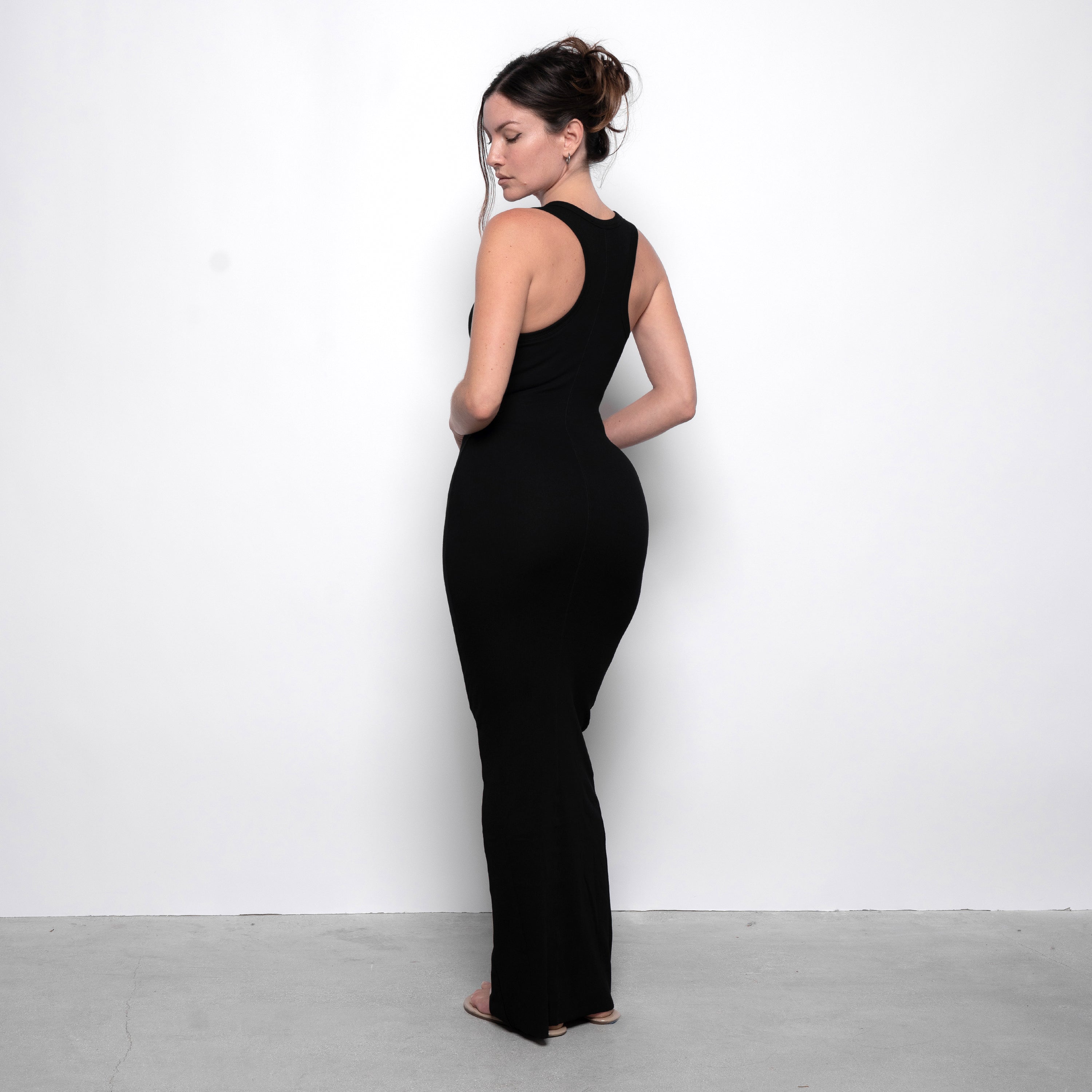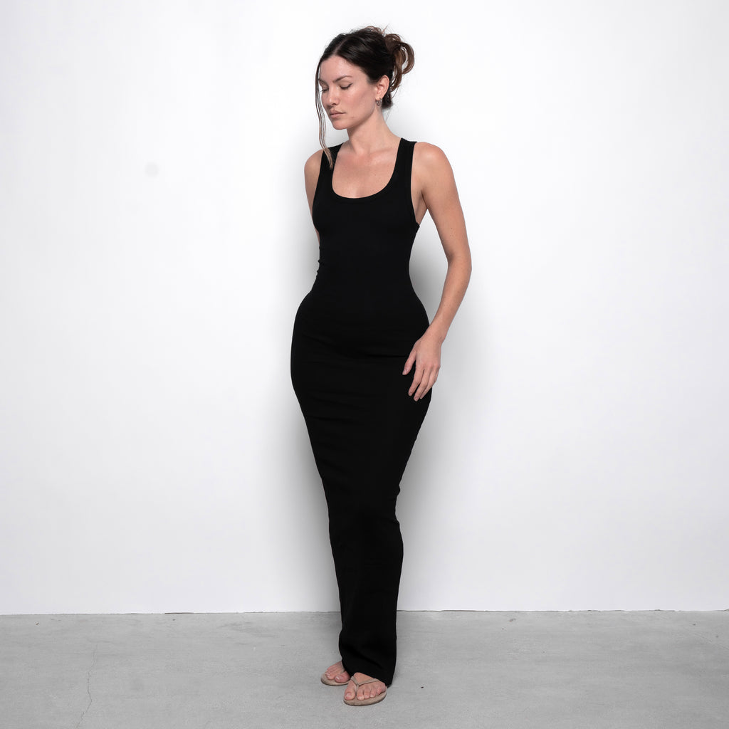 Our ribbed maxi dress is a racerback style maxi dress featuring ribbed cotton material that form fits to the body. Featuring a seam down the back to flatter your shape. The perfect staple for sundress season.