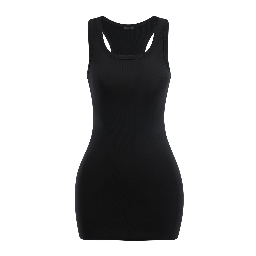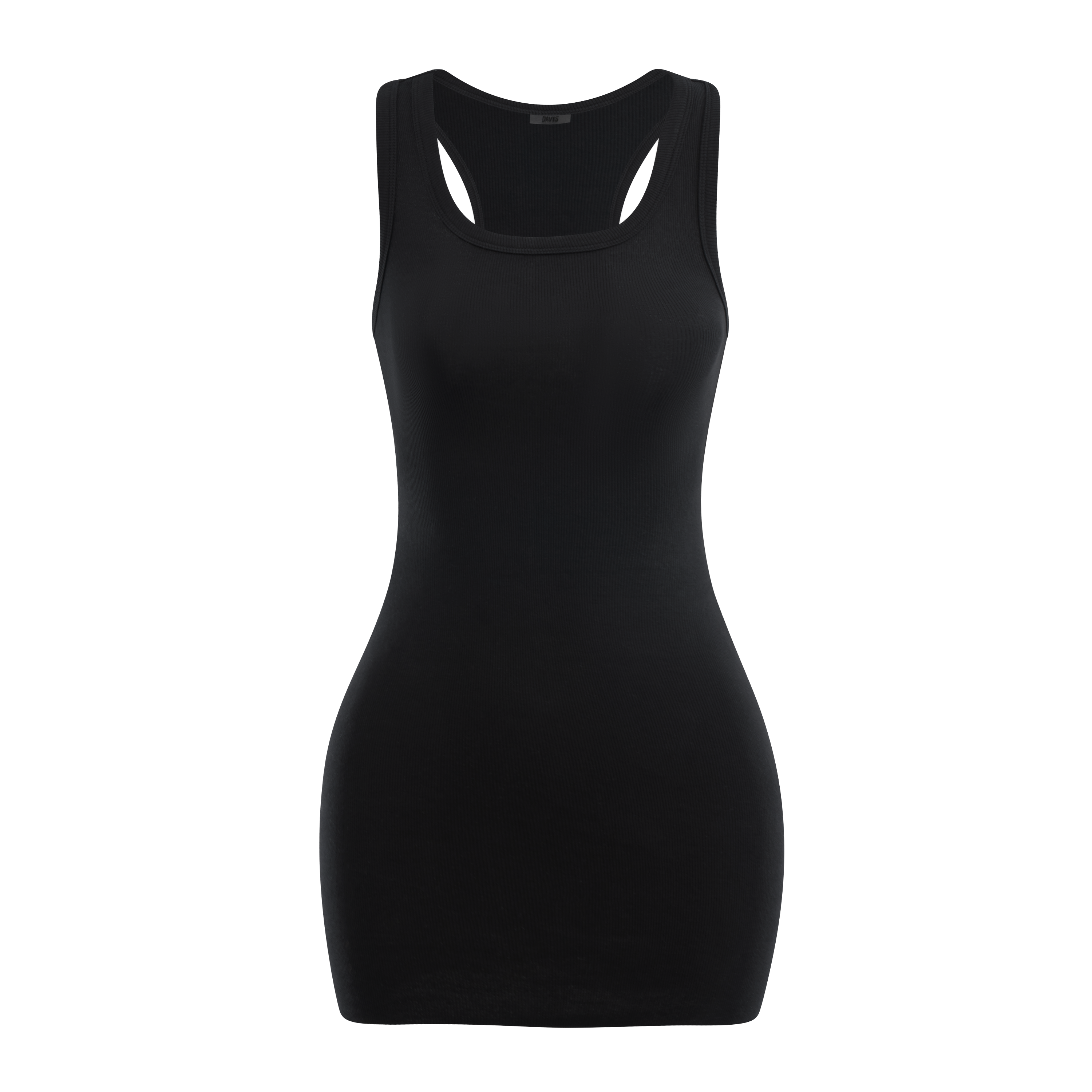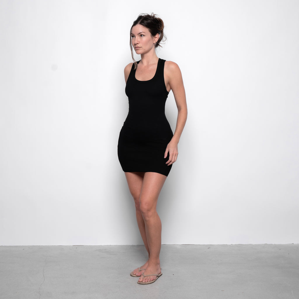 Our ribbed mini dress is a racerback style mini dress featuring ribbed cotton material that form fits to the body. Featuring a seam down the back to flatter your shape. The perfect staple for sundress season.