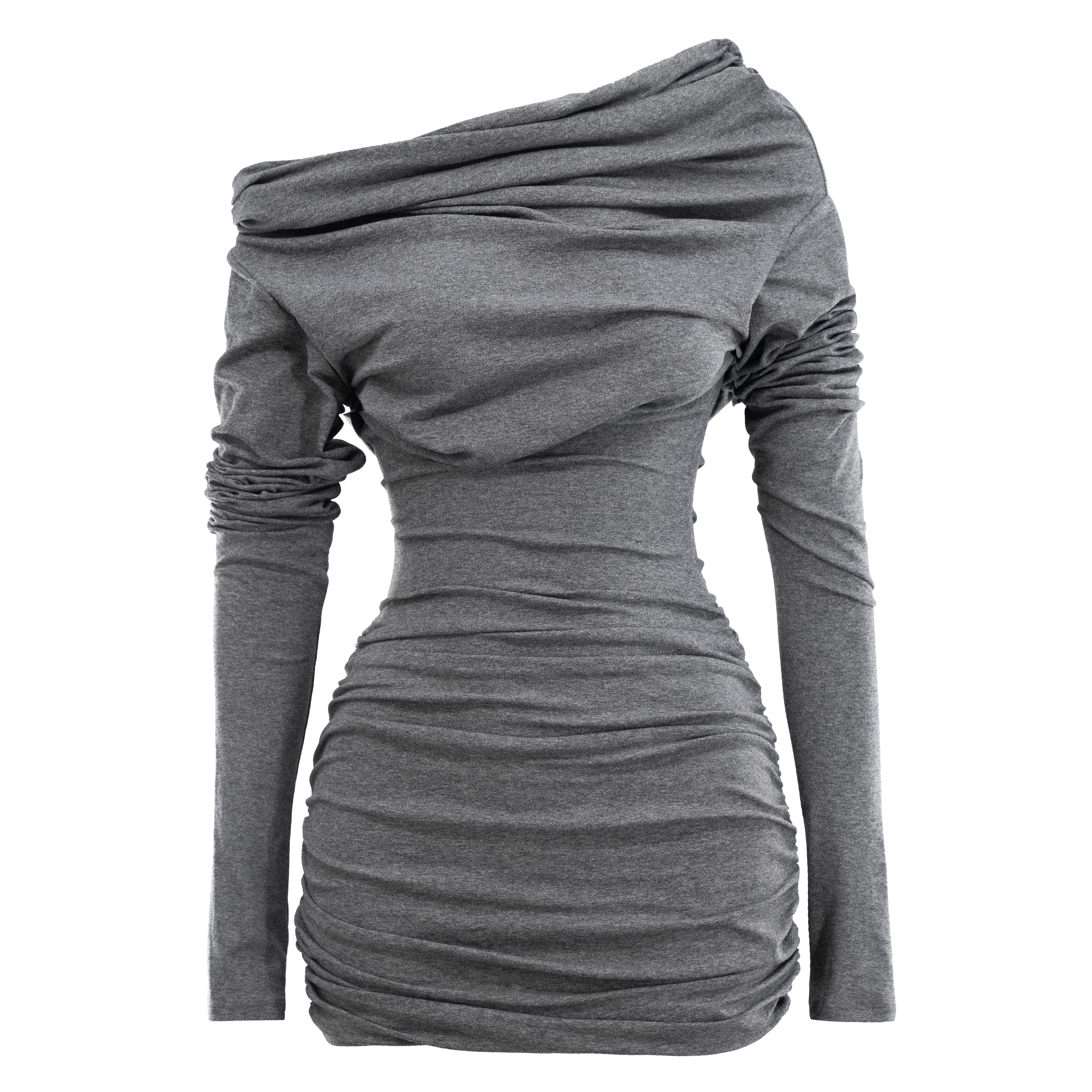 Our Drape off shoulder mini is an off the shoulder, long sleeve style that can be draped in many ways or even worn as a shirt . Ruched on both sides from the waist to the hip, this dress hugs you in all the right places. Single lined so our lighter colors do tend to be more sheer. Pair with a seamless skin-toned thong.